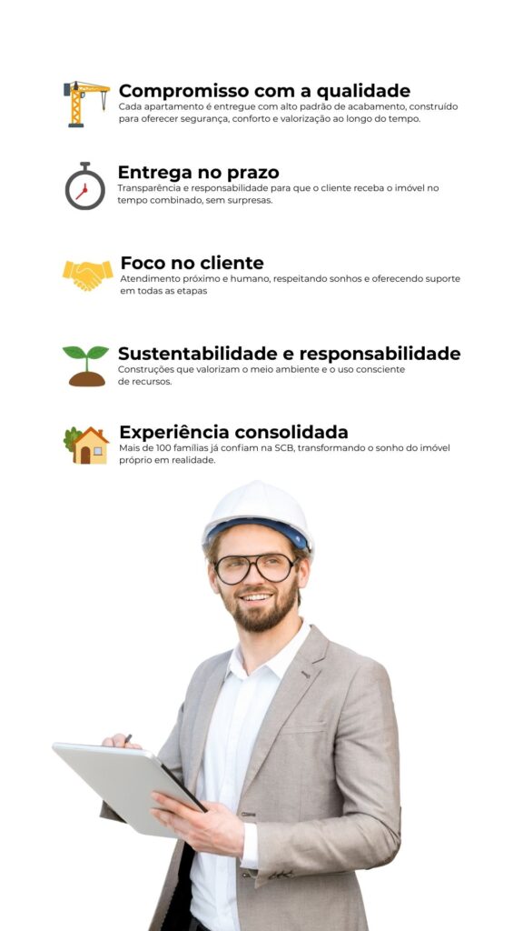 Na SCB, não construímos apenas imóveis, construímos confiança, conforto e sonhos realizados. Escolher a SCB é optar por uma empresa que alia qualidade, segurança e inovação, com atenção a cada detalhe do seu projeto. Nosso compromisso vai além das paredes: entregamos soluções personalizadas,